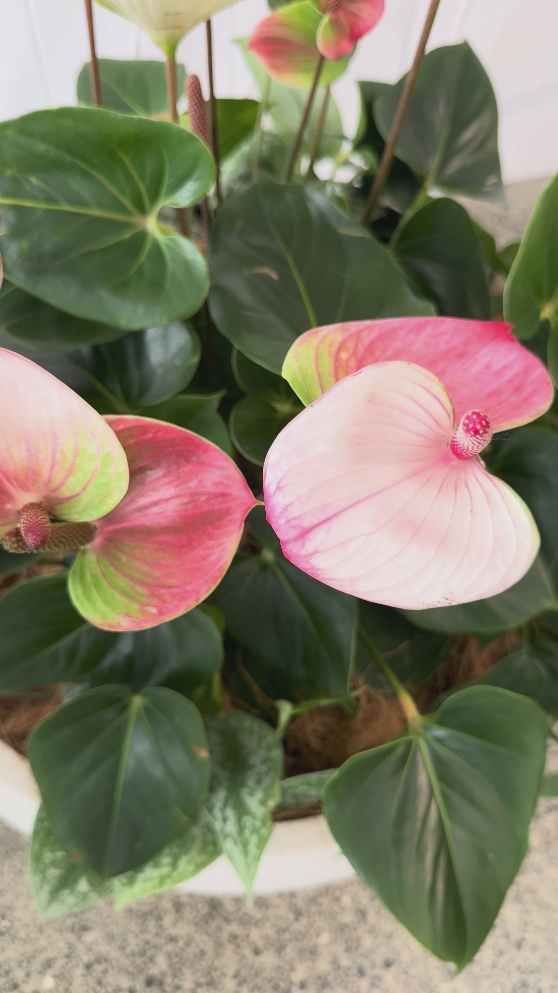 Bring year-round colour into your home with this stunning arrangement. Those soft pink Anthurium blooms aren't just beautiful—they're practically non-stop. These plants can flower continuously for months, giving you that fresh, vibrant look without the weekly flower shop runs. We've paired them with lush Heart Leaf Philodendrons and cascading Trebie Pothos to create layers of rich green foliage that make those pink blooms absolutely pop.